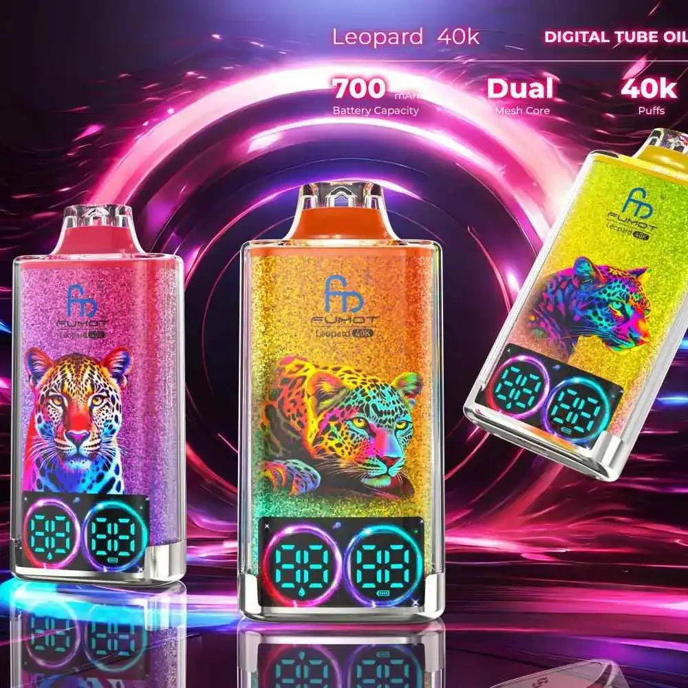RandM Fumot Leopard 40K (40000) Puffs Disposable Vape offers up to 40,000 puffs with a dual mesh coil for smooth, rich vapor. Featuring an RGB dynamic rotating light, digital oil and battery display, and available in 2%, 5% nicotine, it combines performance with visual appeal. Powered by a 750mAh rechargeable battery, this vape is packed with 16 unique flavors, making it perfect for long-lasting and customizable vaping.
